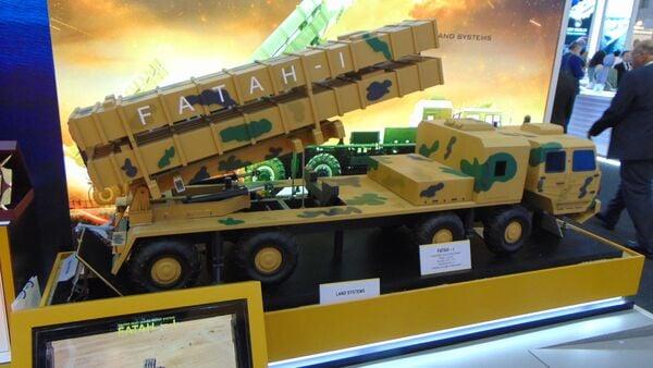 Организация GIDS продемонстрировала модель своей РСЗО GMLRS с транспортно-пусковыми контейнерами для четырёх управляемых реактивных снарядов Fatah-I калибра 301 мм и транспортно-пусковым контейнером для 600-мм управляемой ракеты Fatah-II. (Janes/Nicholas Fiorenza)